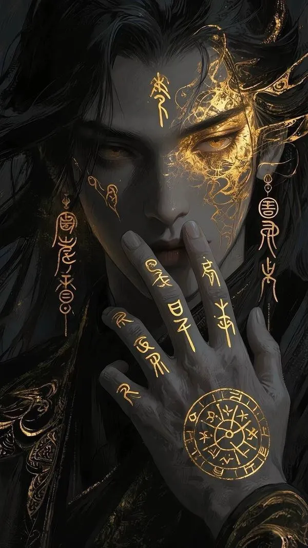 Ảnh nền chân dung nam bí ẩn, họa tiết vàng trên da, ánh sáng thấp tạo chiều sâu u tối.