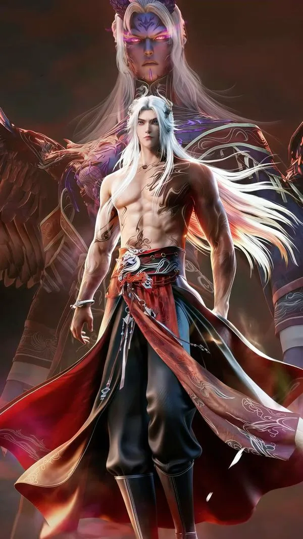 Nhân vật cổ trang tóc trắng, hiệu ứng khói sáng và viền sáng đỏ, bối cảnh rộng rất hùng tráng.