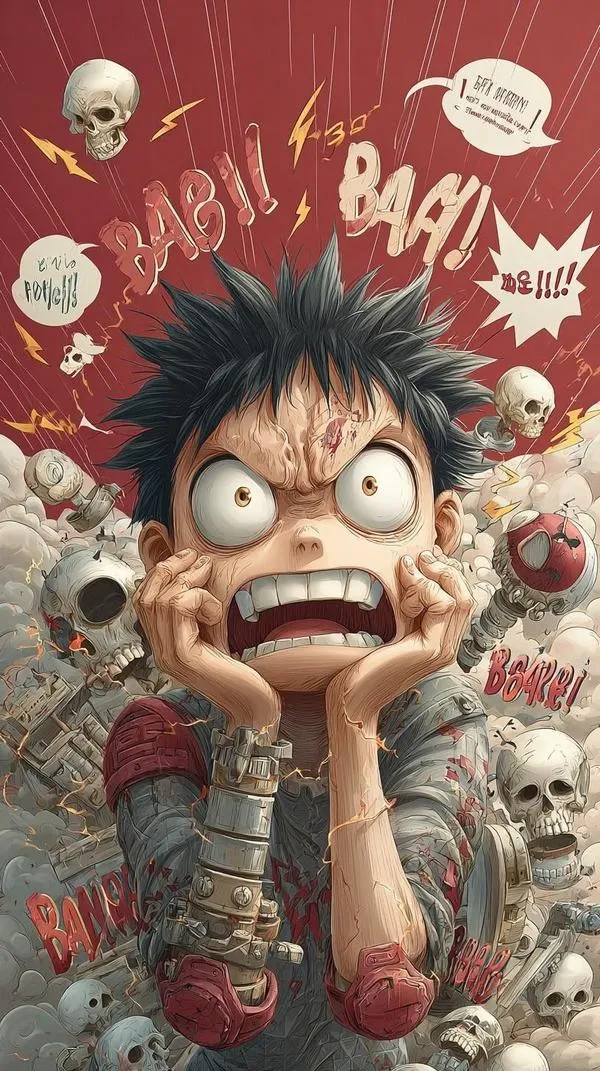 Luffy One Piece biểu cảm hoảng hốt, chi tiết tóc và bóng đổ rõ, nền đỏ họa tiết vui nhộn.