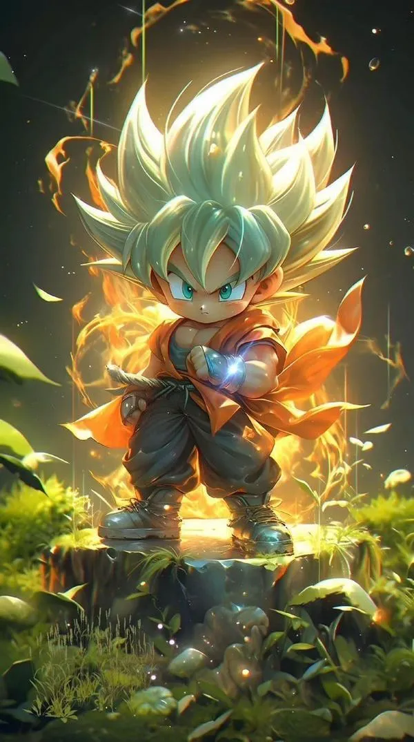 Hình nền Goku chibi đứng giữa rừng, ánh vàng bao quanh, màu xanh lá dịu, chiều sâu ba lớp.
