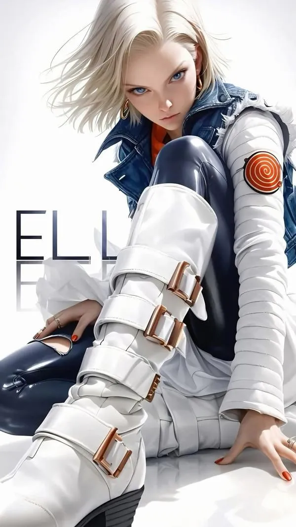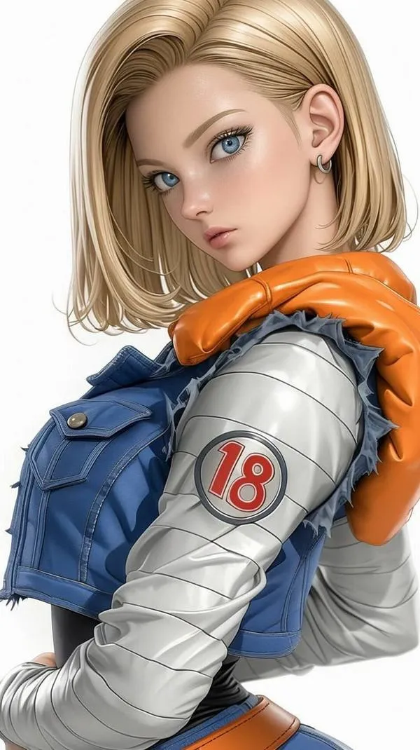 Hình nền Android 18 Dragon Ball trang phục trắng, ánh sáng studio, đường nét gọn và nền sáng sạch.