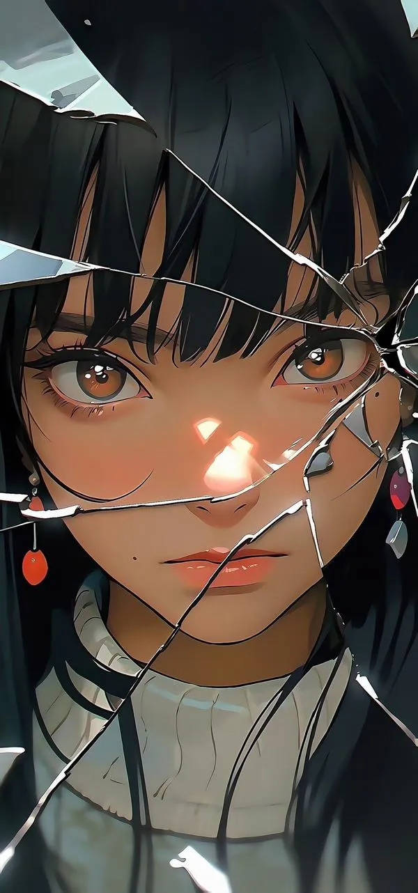 Cô gái tóc đen nhìn thẳng, ánh sáng lạnh, vết xước và nền mờ tạo cảm giác căng thẳng.