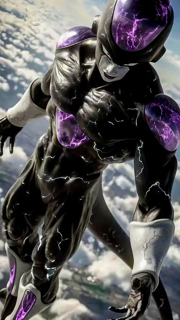 Frieza Dragon Ball nền tím đậm, ánh viền lạnh, chất liệu da bóng và chi tiết cơ thể sắc nét.