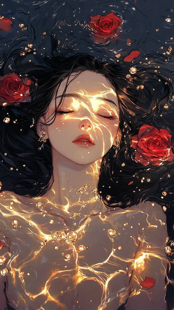 Cô gái tóc đen nằm ngửa, ánh vàng loang như sao rơi, nền tối tạo không khí huyền ảo.