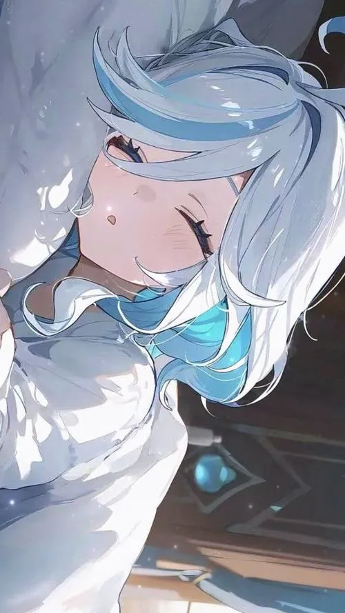 Tranh Furina tí hon anime, má ửng hồng, miệng cười nhẹ, hợp đặt hình nền điện thoại.
