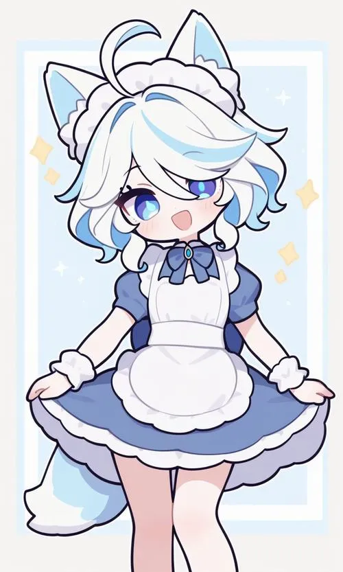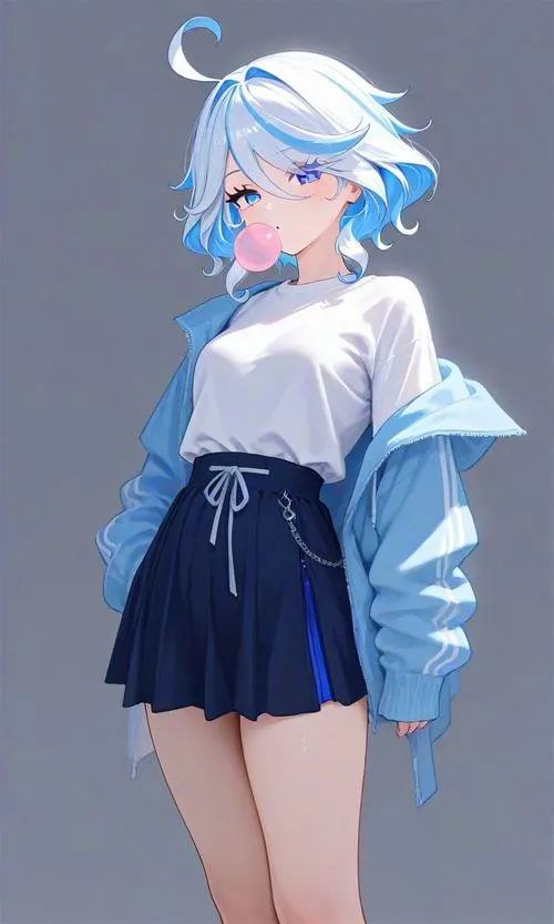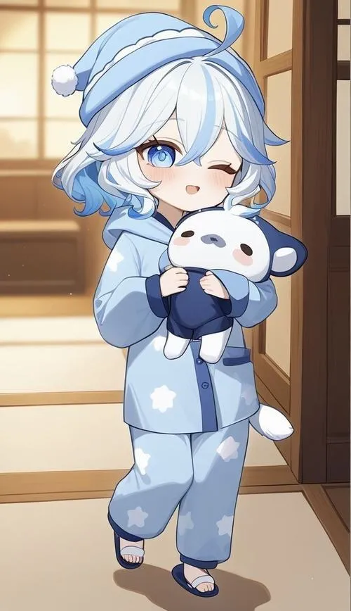 Minh hoạ Furina đáng yêu nét mượt, tông xanh trắng nhấn nhẹ, cảm giác thân thiện dễ gần.