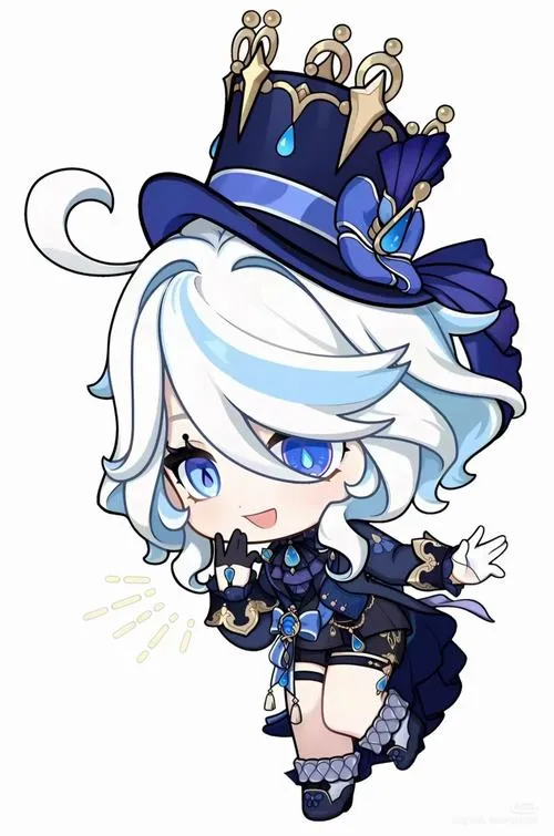 Ảnh Furina phong cách chibi tóc bồng bềnh, viền tóc bay, bóng đổ nhẹ, nhìn rất mềm.