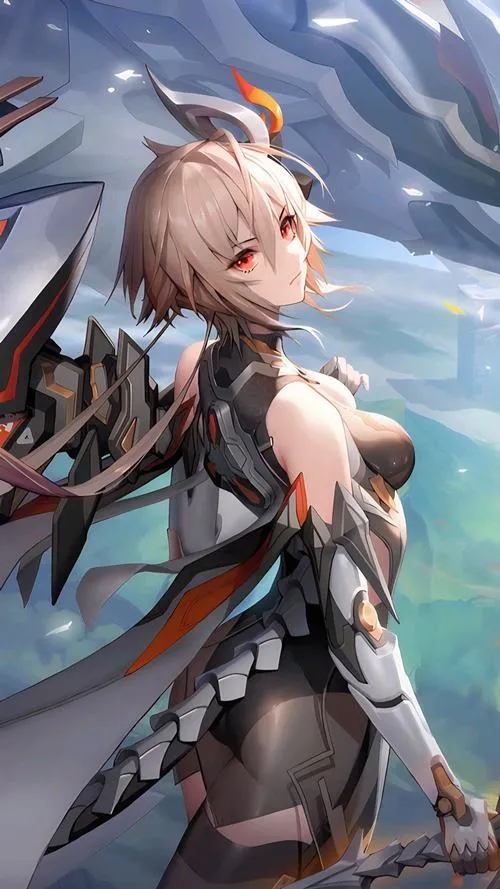 Hình fanart Veres anime, màu nhấn đỏ rượu, chi tiết giáp và dây vũ khí rõ, nền tối sạch.