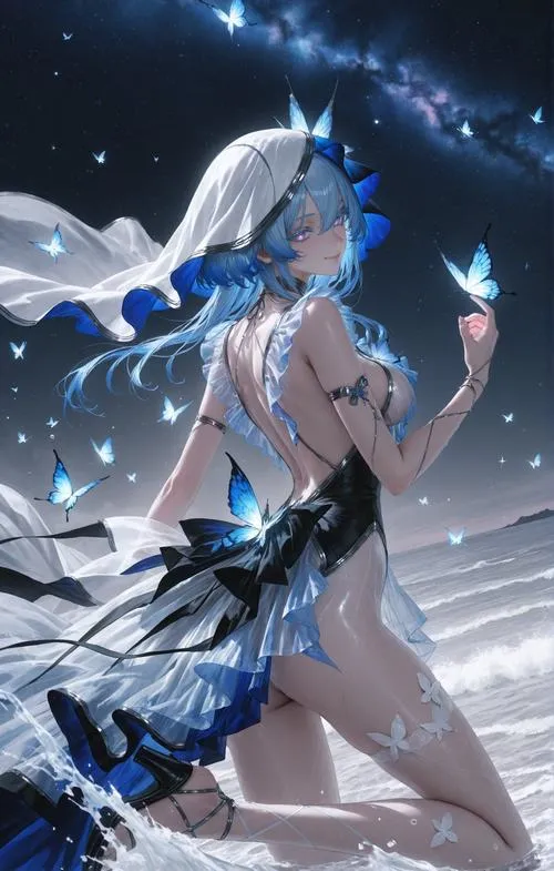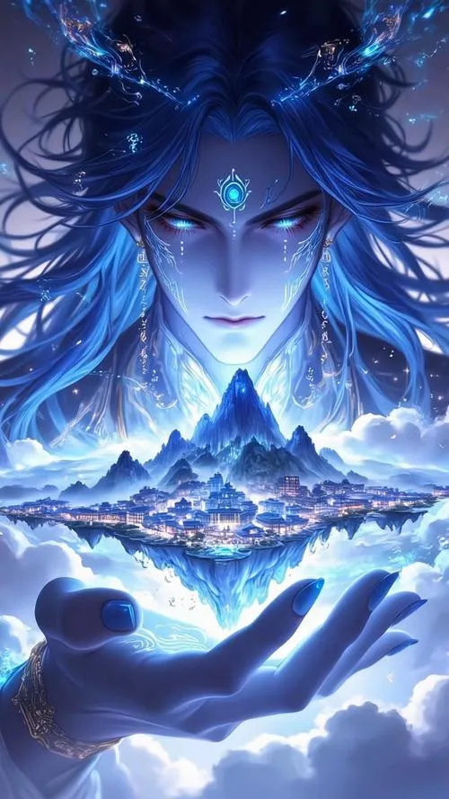 Hình fanart Sephera anime, tông xanh nước, hạt sáng mềm, nền sạch icon dễ nhìn.