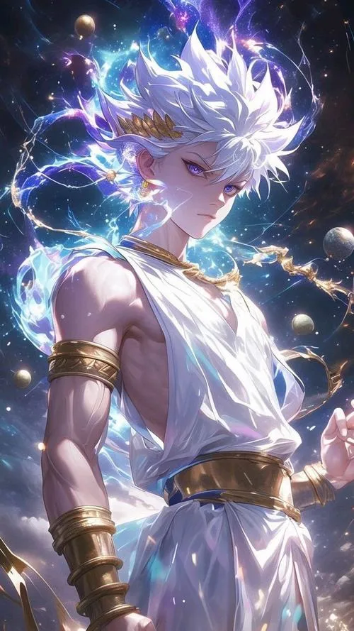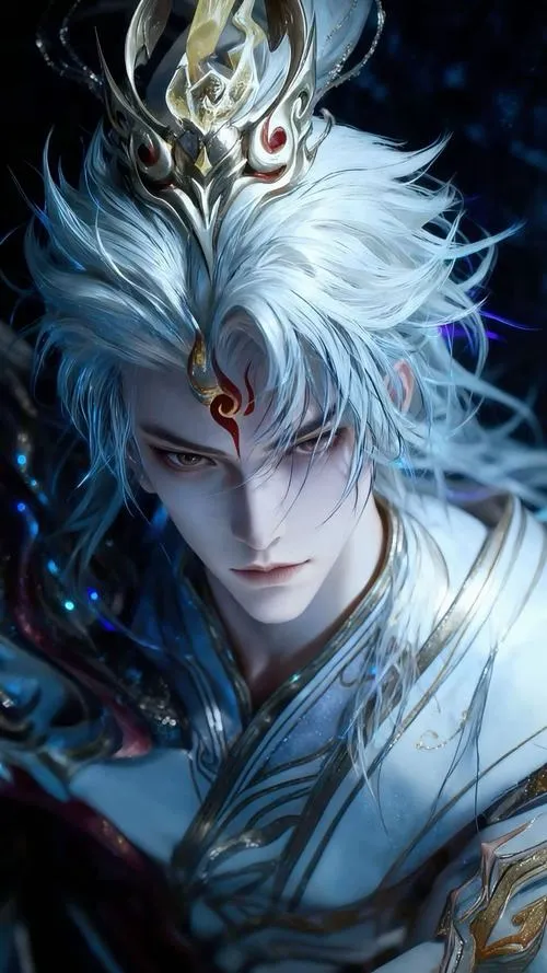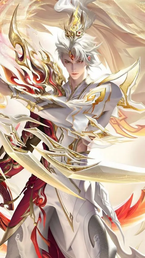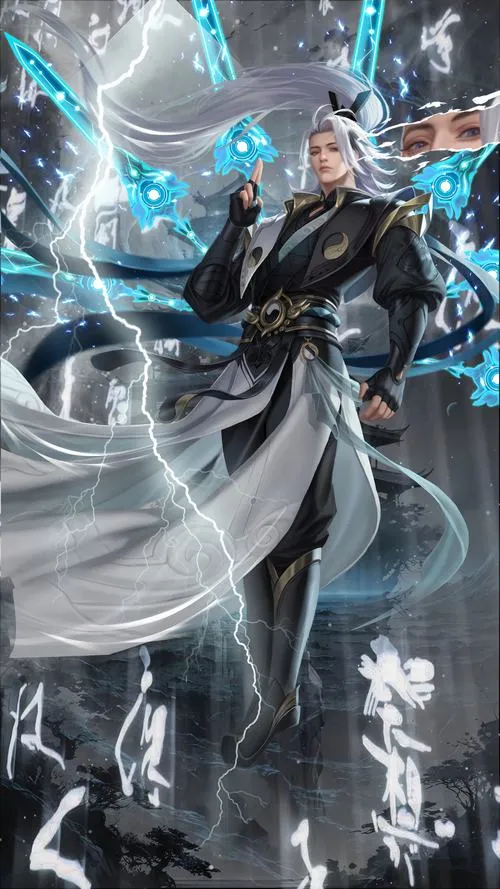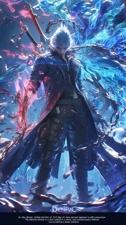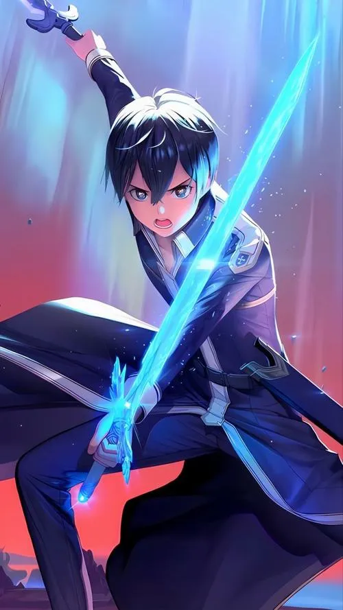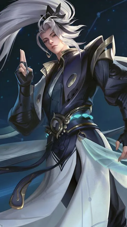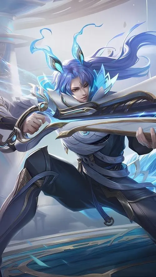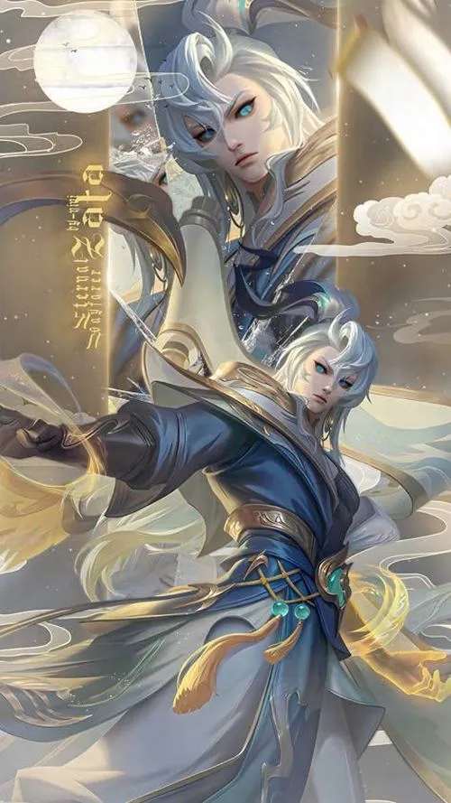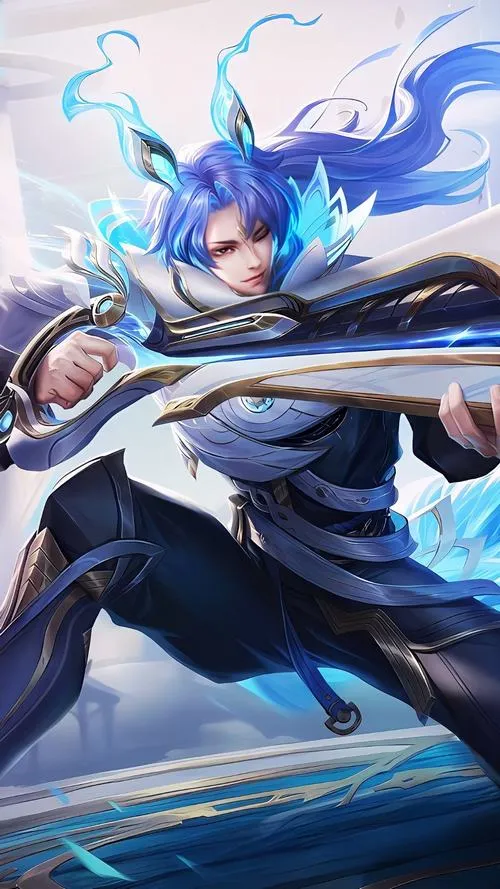 Hình ngầu Bright ánh sáng trắng xanh, nền tối sạch, điểm nhấn ở tóc và kiếm, rất bắt mắt.