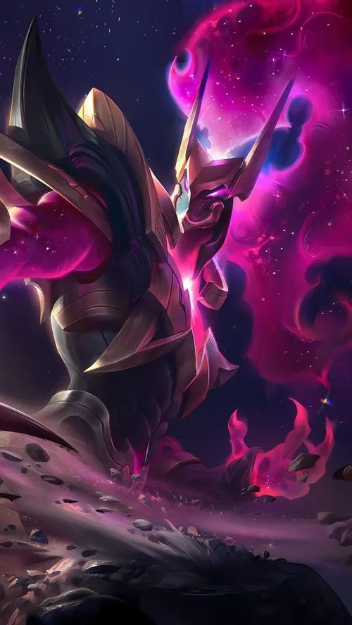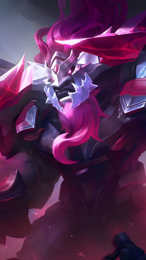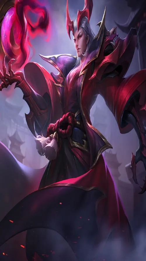 Hình nền Liên Quân Sinestrea tông đỏ tím, hiệu ứng hạt sáng, nền khói mờ, nhìn rất “lạnh”.