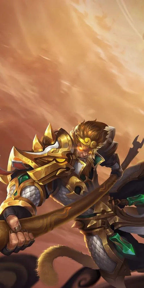 Hình Liên Quân Wukong tông vàng nâu, gậy sáng, nền trơn sạch, nhìn lâu không mệt.