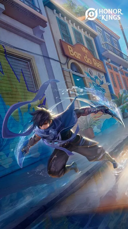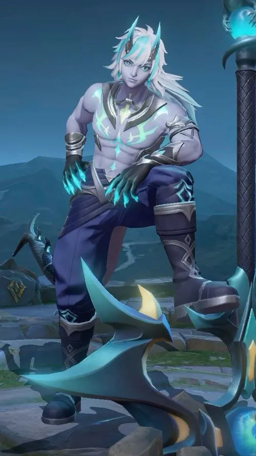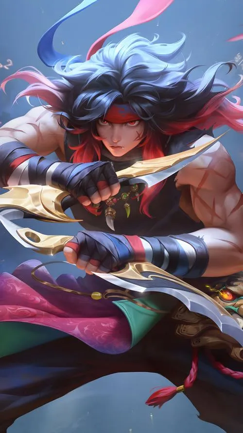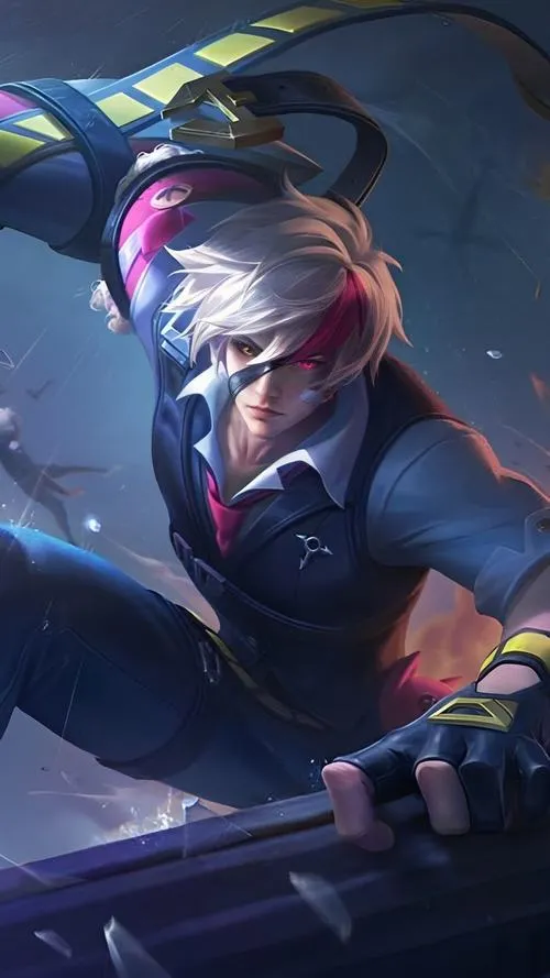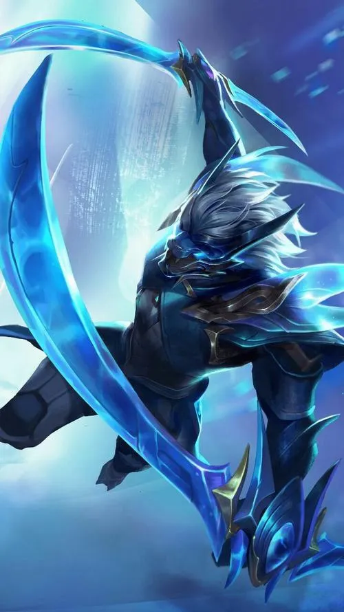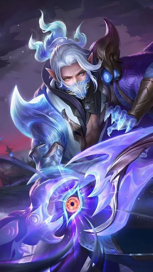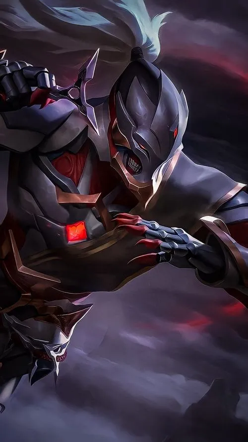 Ảnh Liên Quân Nakroth góc nghiêng điện ảnh, điểm nhấn ở mắt, vũ khí sáng lạnh, bố cục dọc 9:16.