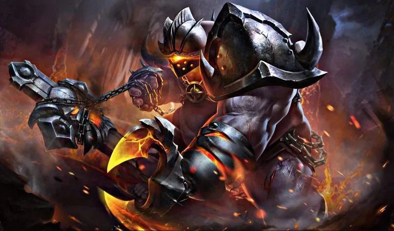 Ormarr cầm búa chiến tông lửa cam vân giáp rõ ánh viền mạnh nền giao tranh mờ vừa đủ