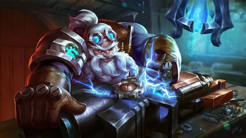 Gildur giơ nắm đấm vàng rực nền sáng mạnh ánh viền dày vân giáp rõ trong ảnh 4K
