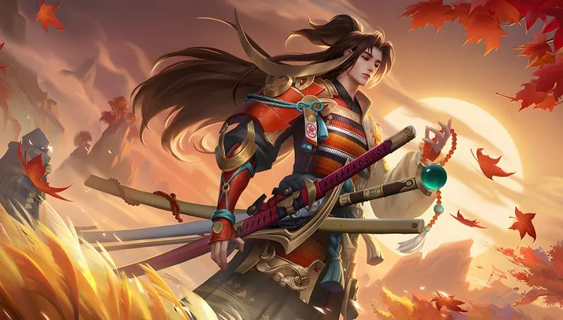 Ryoma lao qua bụi cát vàng chi tiết áo giáp và kiếm rõ nét nền mờ tạo chiều sâu