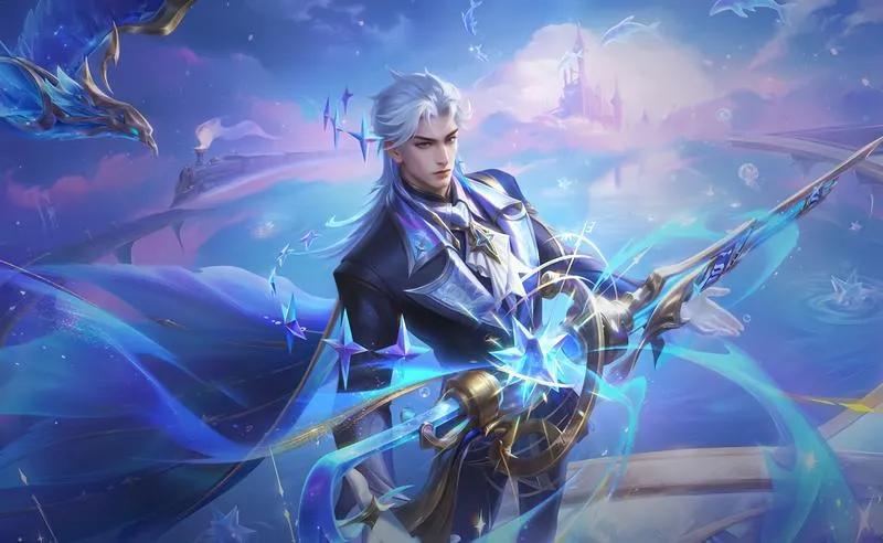 Dirak nâng trượng ma pháp nền tím xanh huyền ảo hiệu ứng chiêu lấp lánh hạt sáng