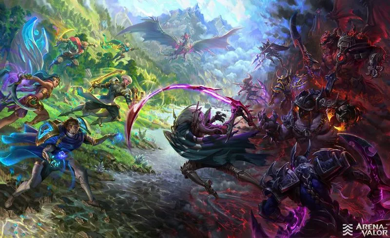 Arena of Valor poster tông tối vàng logo nổi bật nhiều tướng xếp lớp hợp ảnh bìa