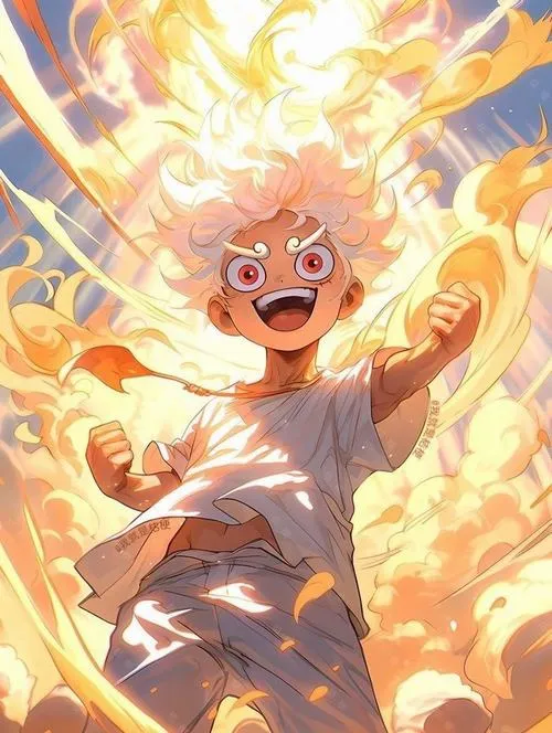 Ảnh Luffy đầu to thân nhỏ giữa khung cảnh rực lửa, ánh sáng mạnh, nhìn khá ngầu kiểu anime.