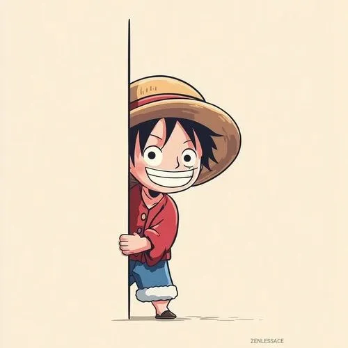 Hình Luffy đầu to thân nhỏ đang thò mặt từ mép khung, mũ rơm nghiêng, vibe tinh nghịch.