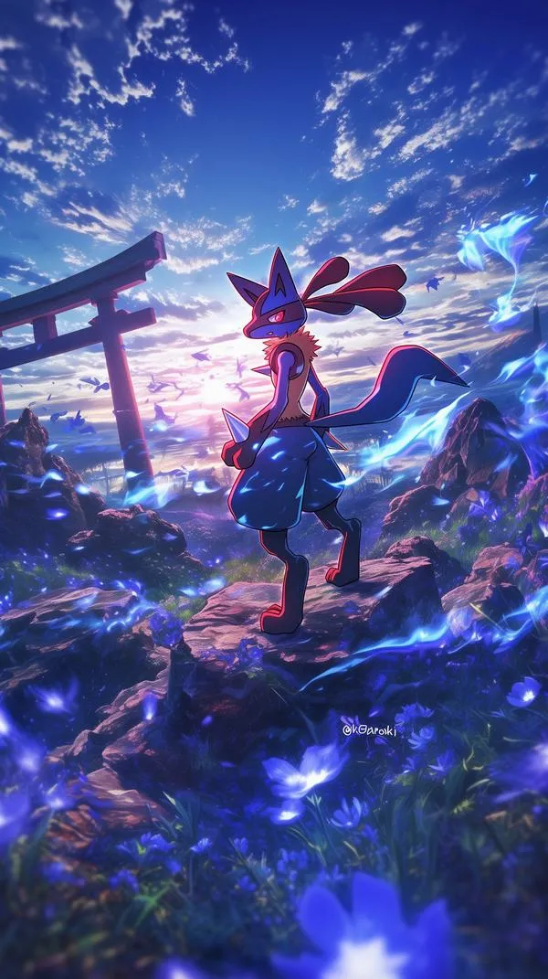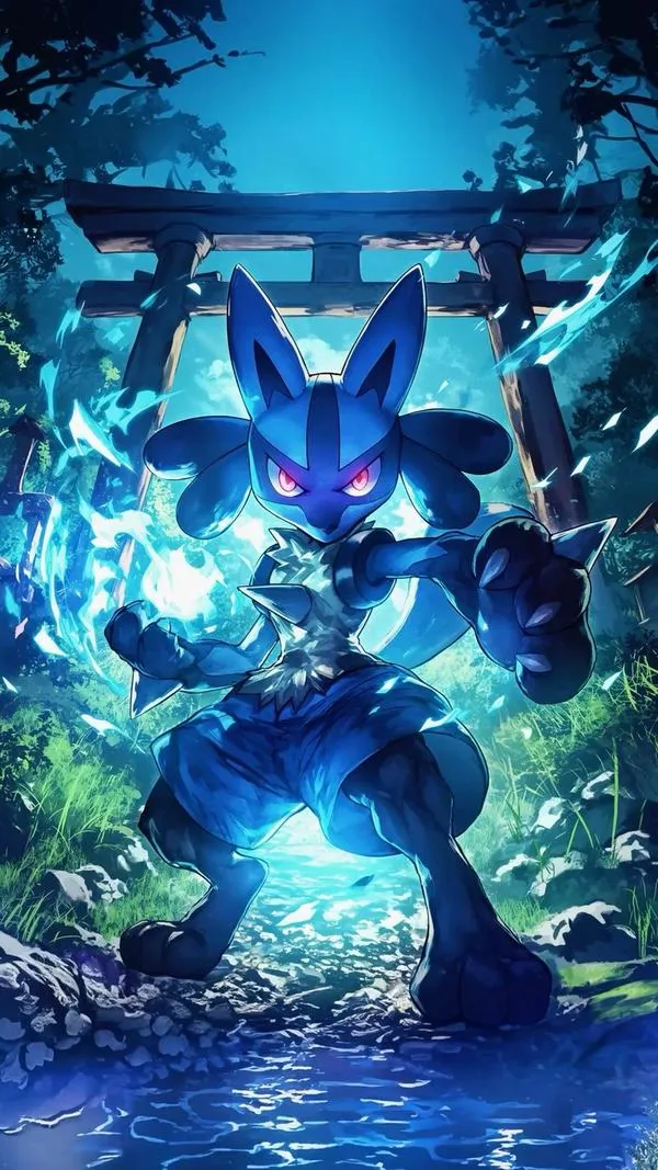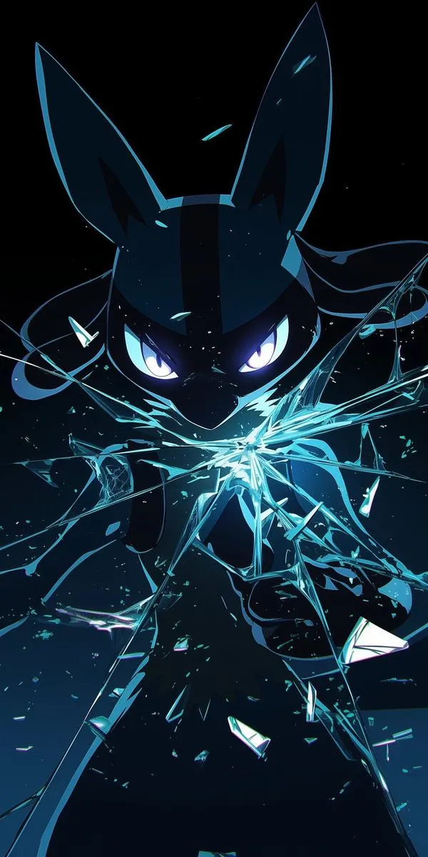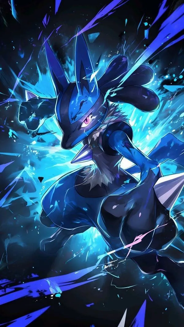 Hình nền iPhone Lucario bùng aura xanh, nền tối sâu, điểm sáng tập trung giúp icon nổi gọn.