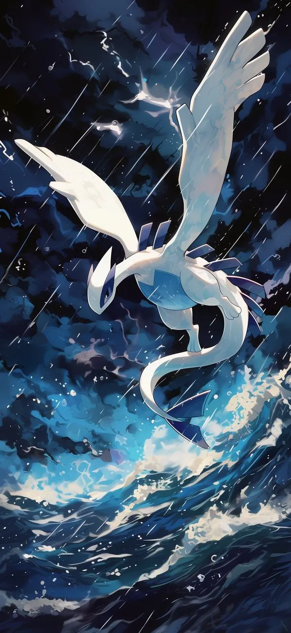 Lugia lướt trên sóng bão, mây sấm dày, nền biển sâu tạo chất sử thi rất đã.