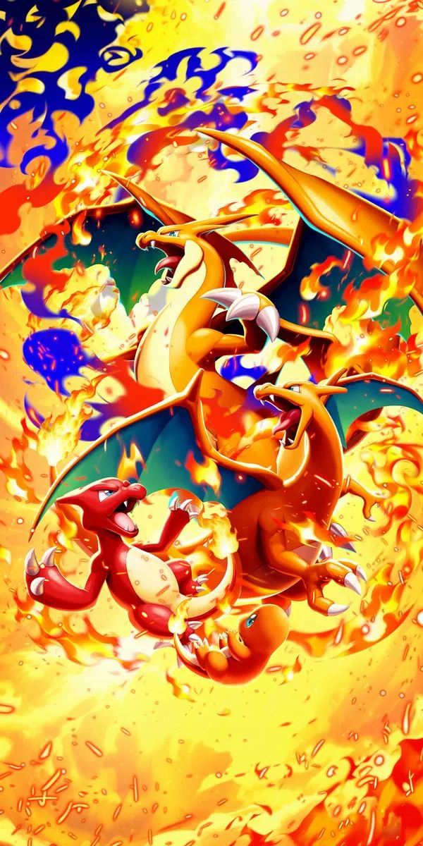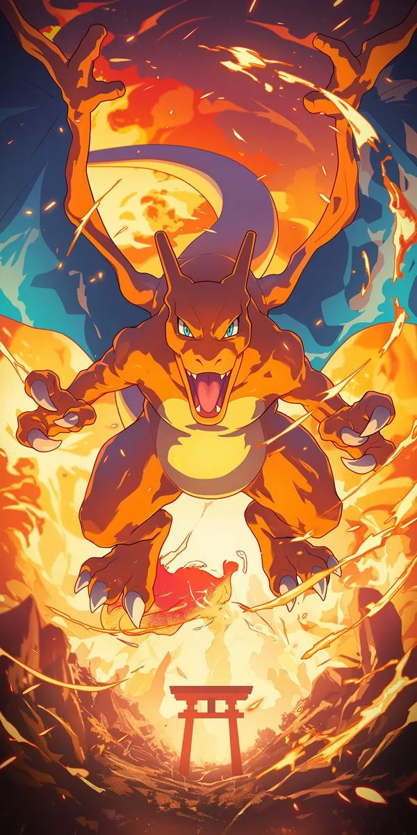 Charizard phun lửa vàng cam, nền rực chói, hạt bụi lấp lánh tạo cảm giác hoành tráng.