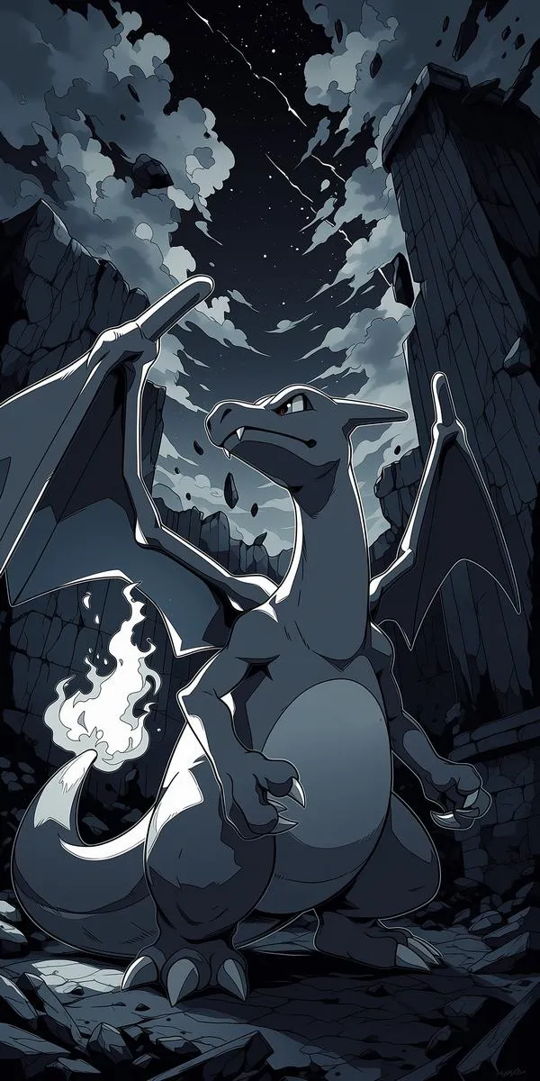 Charizard đơn sắc mạnh bạo, bóng đổ sâu, cảm giác dữ dằn như cảnh cao trào cốt truyện.