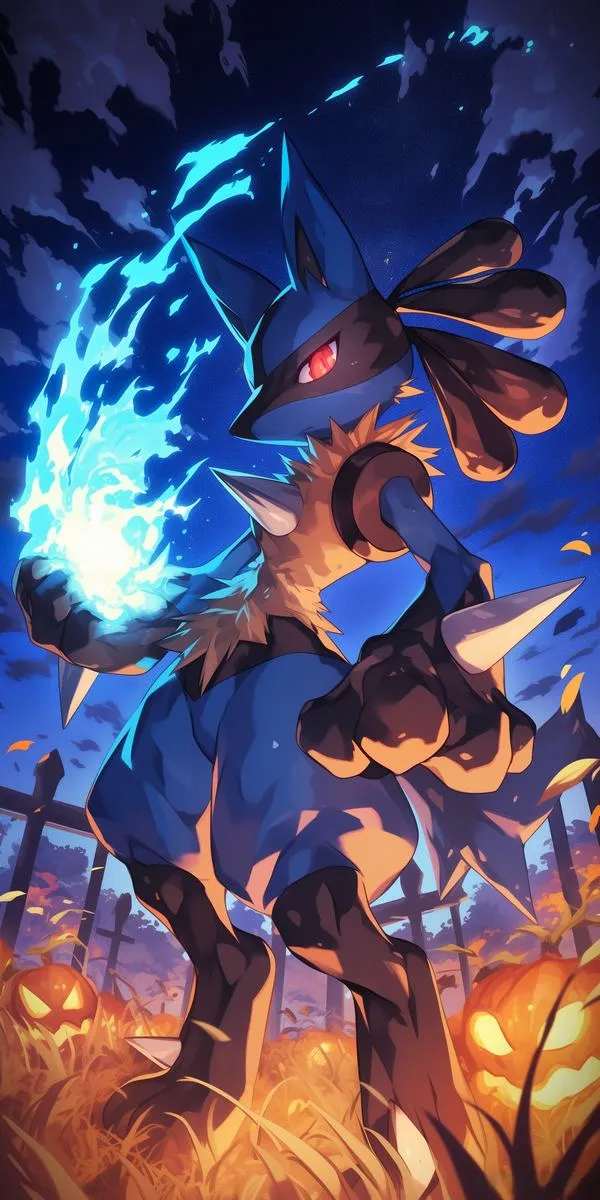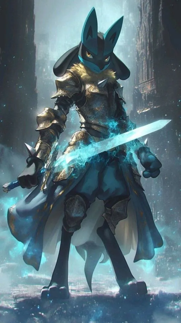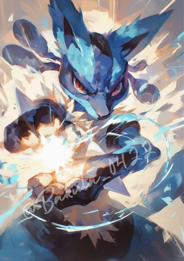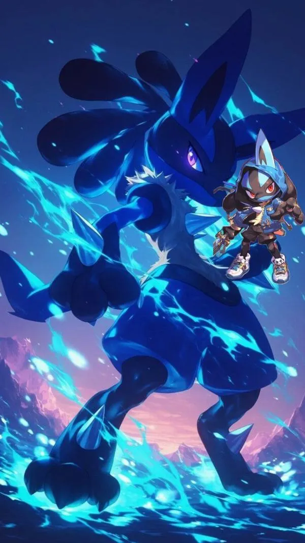 Lucario neon xanh tím, hiệu ứng năng lượng dày, ánh viền sáng làm tổng thể cực nổi bật.