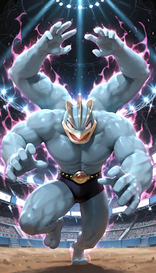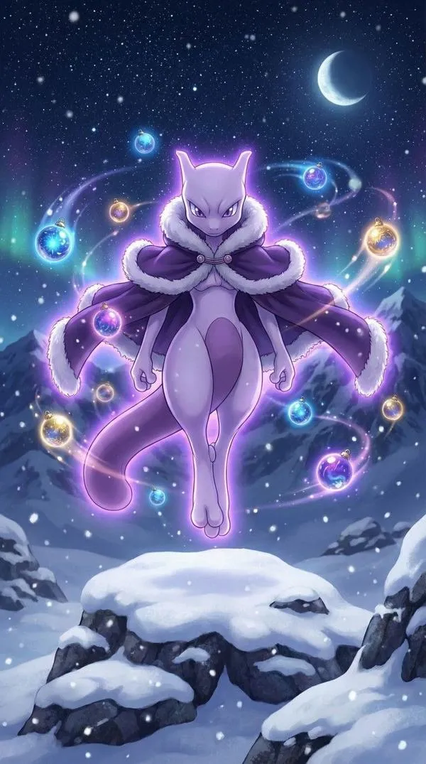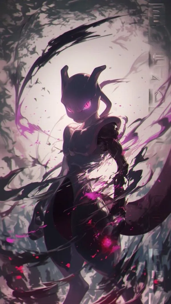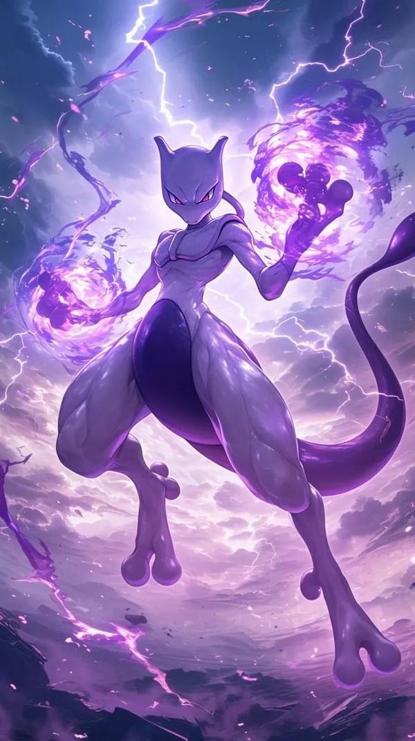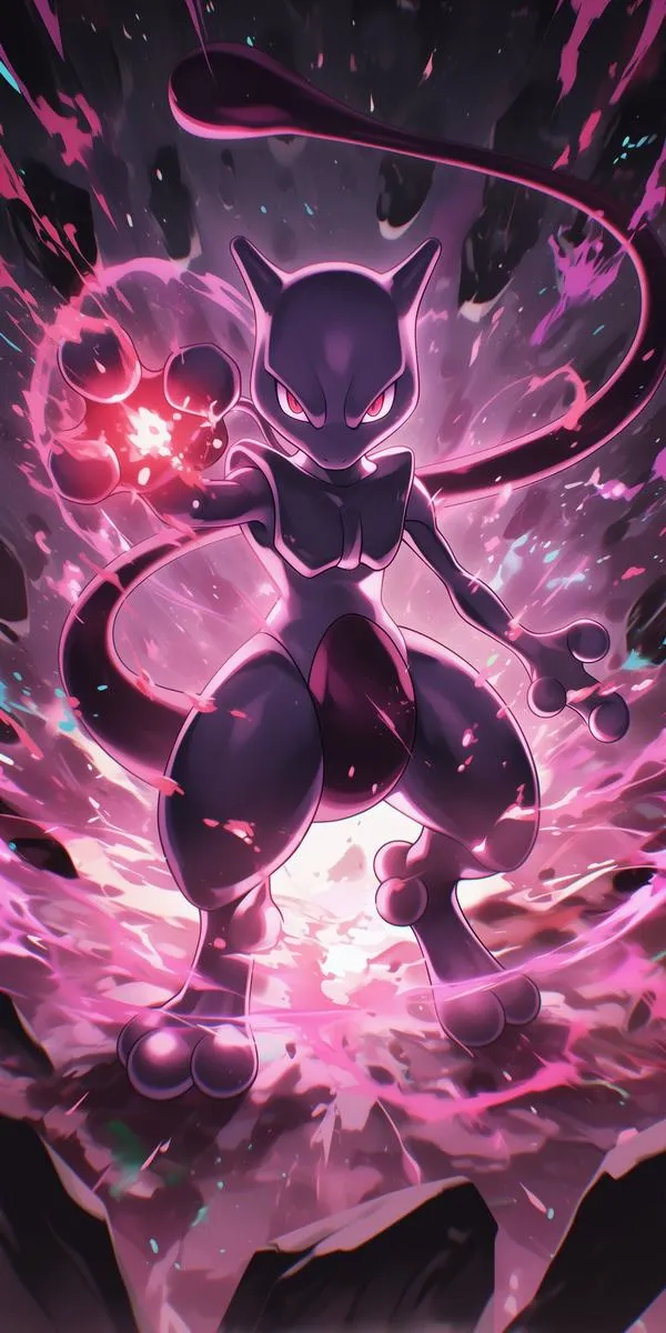 Hình nền điện thoại Mewtwo bùng hào quang tím, nền vũ trụ xoáy mạnh, ánh viền sắc nét.