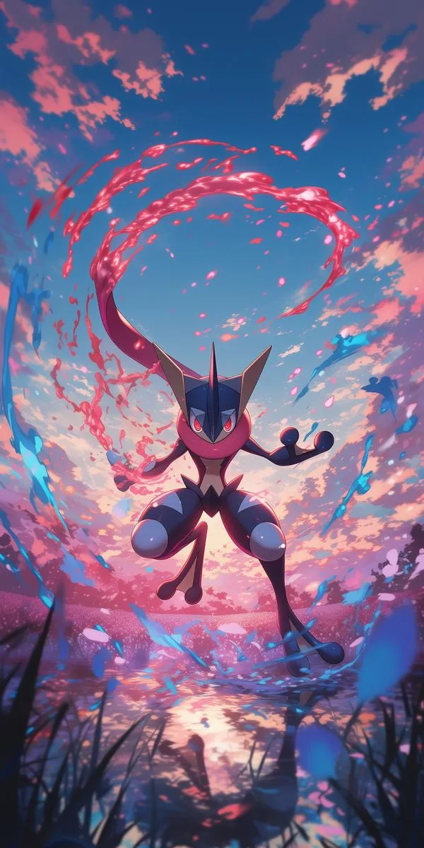 Màn hình khóa Greninja phong cách neon, tia sáng xanh hồng, vibe hiện đại nhưng vẫn chất game.