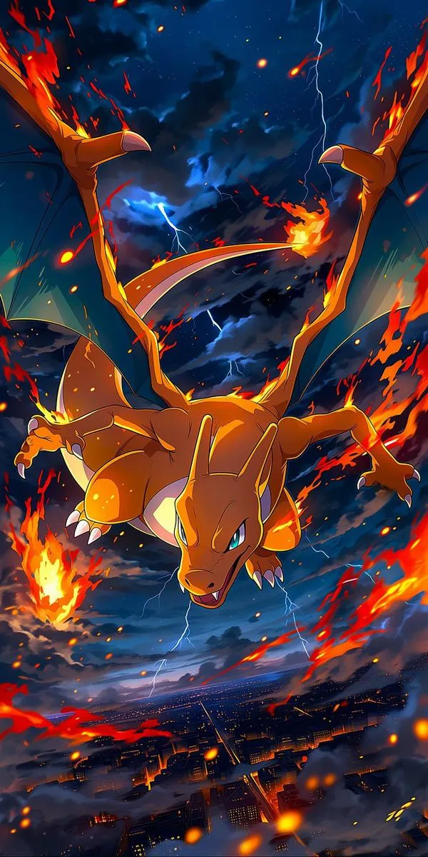 Ảnh nền Charizard bay trên dung nham, tro đỏ cuộn, ánh sáng viền nóng làm nhân vật bật lên.