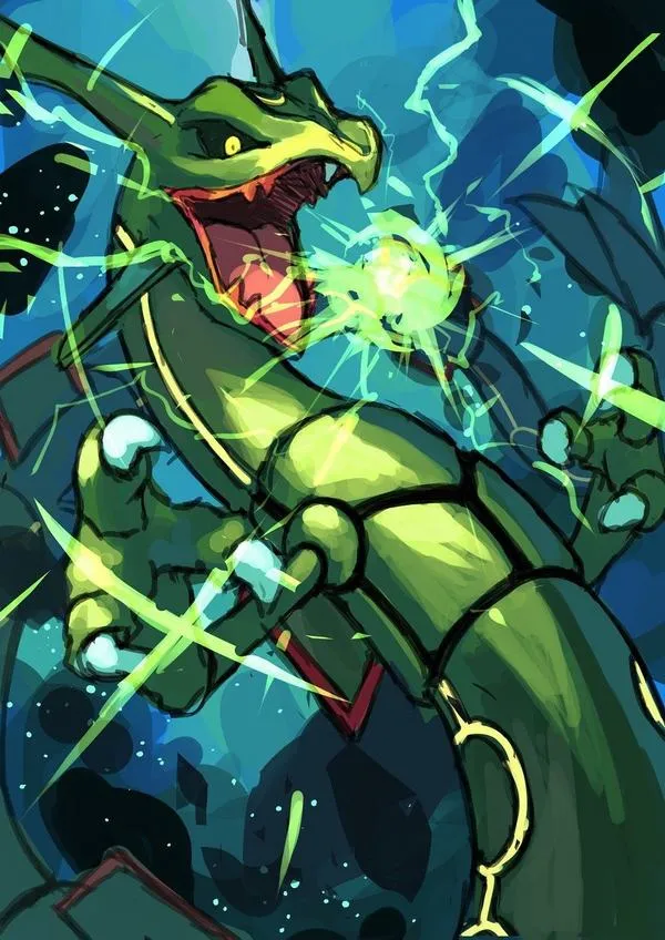 Rayquaza uốn lượn giữa trời, mây gió xoáy tròn, cảm giác điều khiển thời tiết rất rõ.