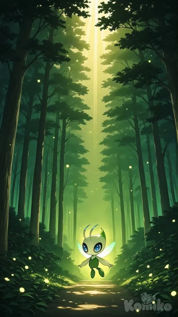 Celebi giữa rừng sáng, ánh xanh dịu, gợi liên tưởng du hành thời gian và câu chuyện cổ tích.