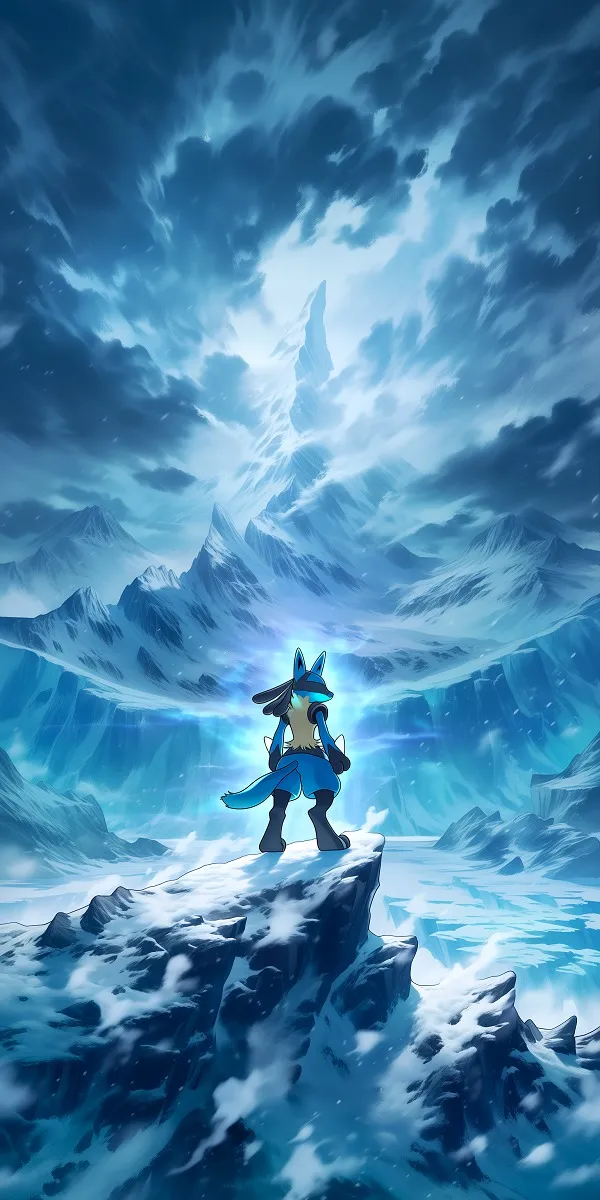 Ảnh màn hình chờ Lucario giữa băng giá, hơi nước mờ, ánh hào quang xanh làm khung cảnh lạnh.