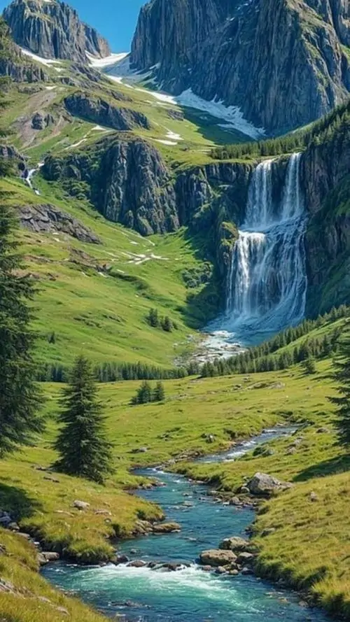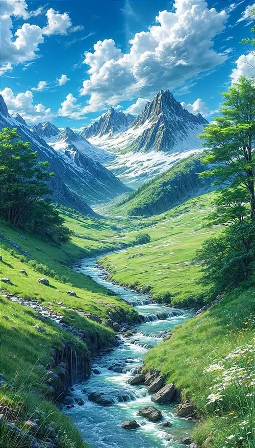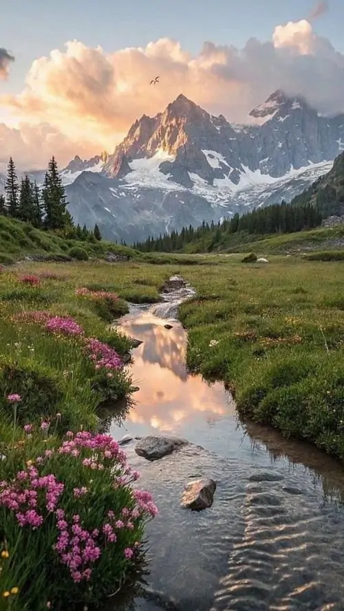 Hình nền điện thoại con đường nước nhỏ cắt qua đồng cỏ xanh, nền sau là núi cao phủ tuyết và trời quang khiến bố cục dọc này trông vừa ngầu vừa thoáng