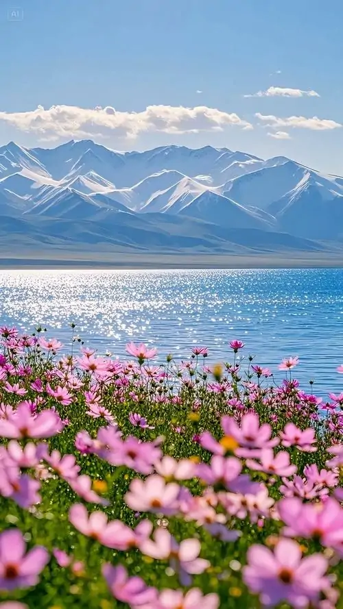 Hồ nước nằm giữa thung lũng cỏ hoa, dãy núi tuyết phía sau hiện lên rõ từng lớp nên ảnh nền cảnh vật chất lượng cao này cho cảm giác rộng và rất thoáng
