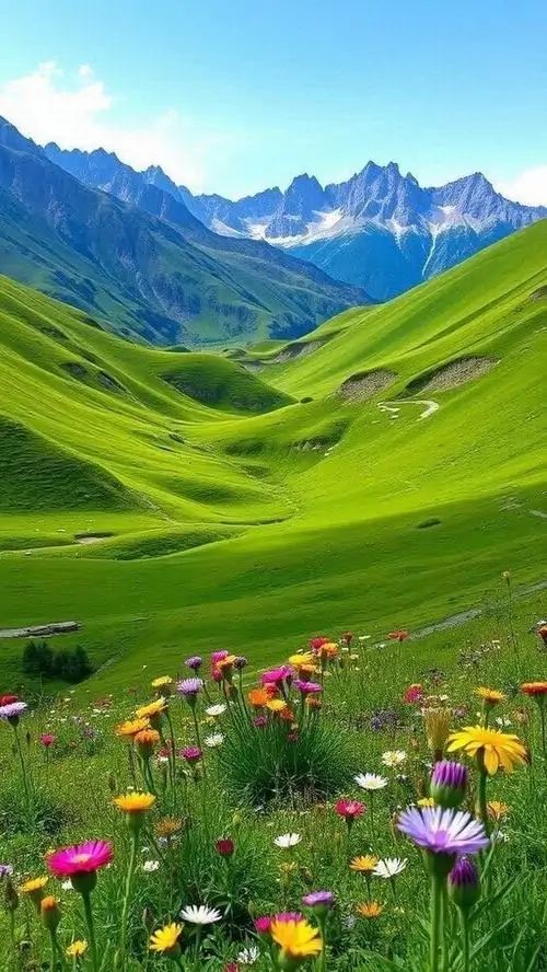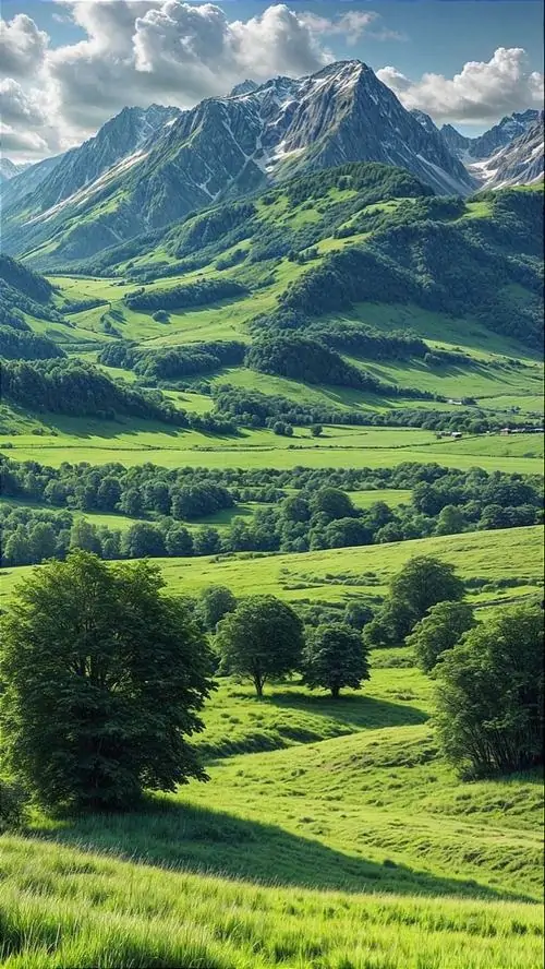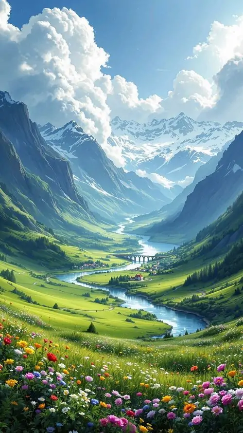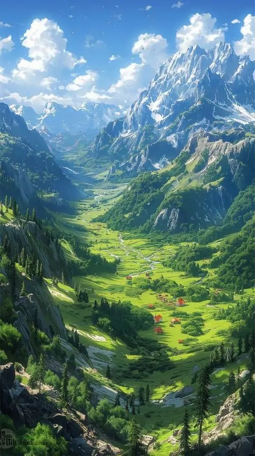 Thung lũng rộng mở với đồng cỏ non và tia nắng trên cao, các đỉnh núi phủ tuyết phía sau khiến ảnh phong cảnh 4K cho di động nhìn rất thoáng và khỏe mắt