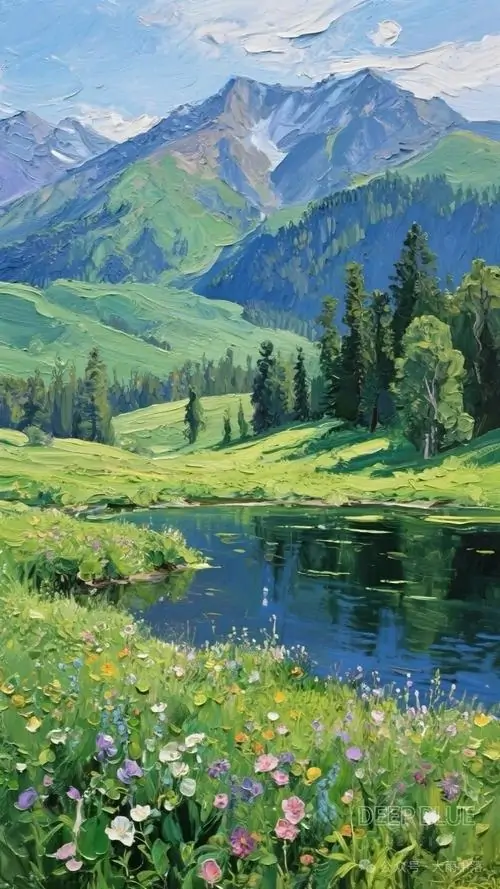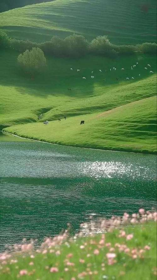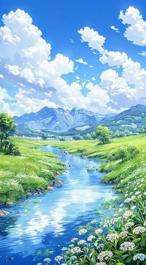 Dòng sông xanh phản chiếu mây trời chạy qua bãi hoa ven bờ, lớp cỏ non và núi xa làm khung cảnh sáng bừng như buổi trưa đầu hạ rất đẹp
