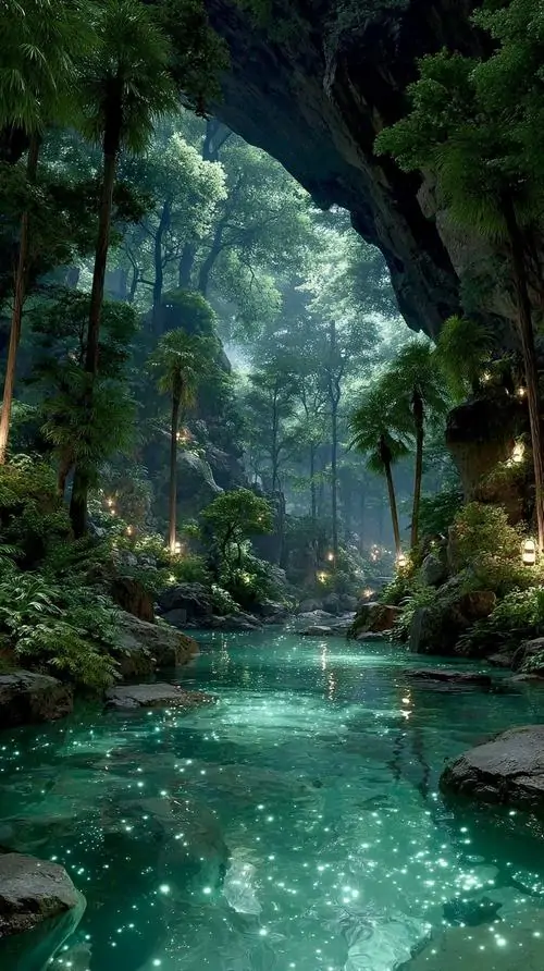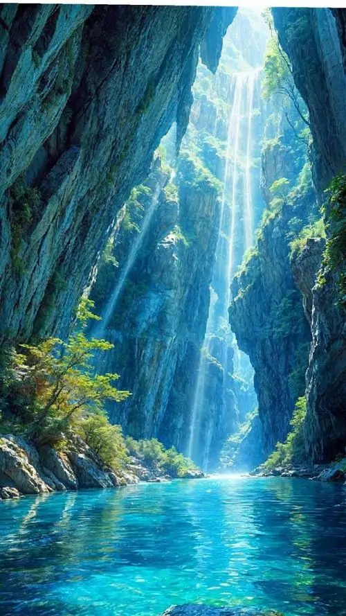 Hình nền điện thoại khe nước xanh phát sáng giữa vách đá dựng, tầng cây rủ xuống và ánh sáng lạnh bên trong làm khung dọc này ngầu theo kiểu thiên nhiên 4K