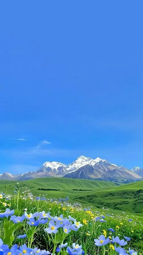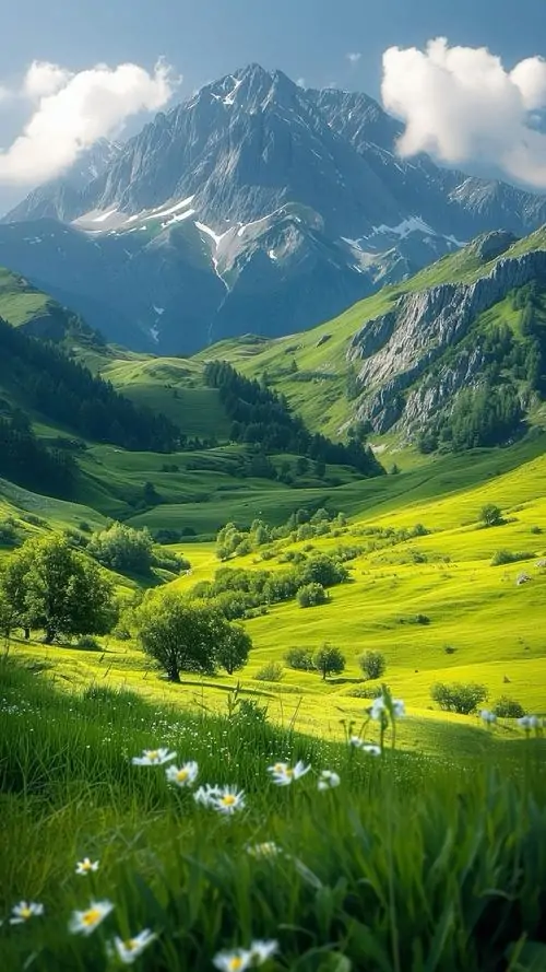 Ảnh nền đt iPhone sườn núi xanh mở rộng trước đỉnh đá cao, từng mảng hoa trắng rải rác trên đồng cỏ làm ảnh nền cảnh sắc này vừa tươi vừa rất 4K
