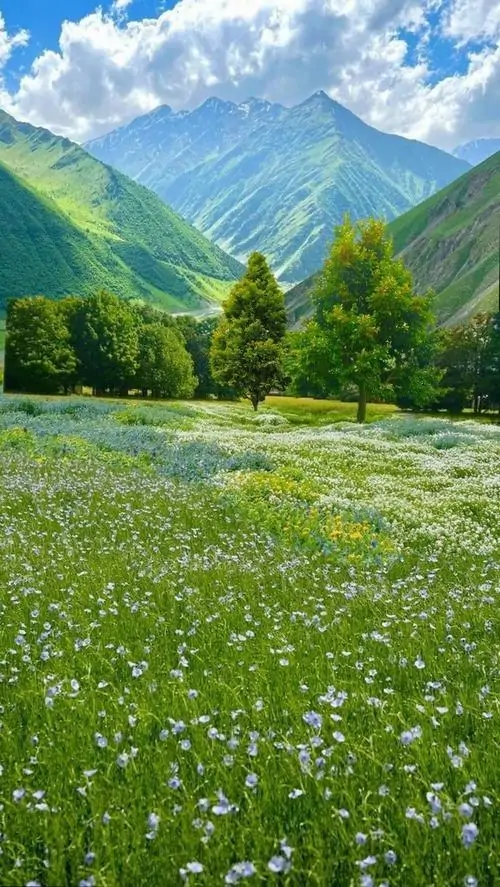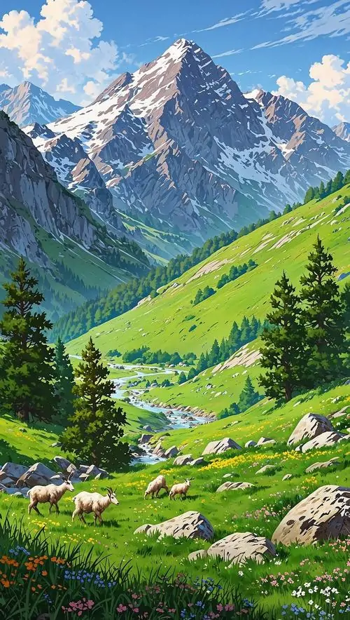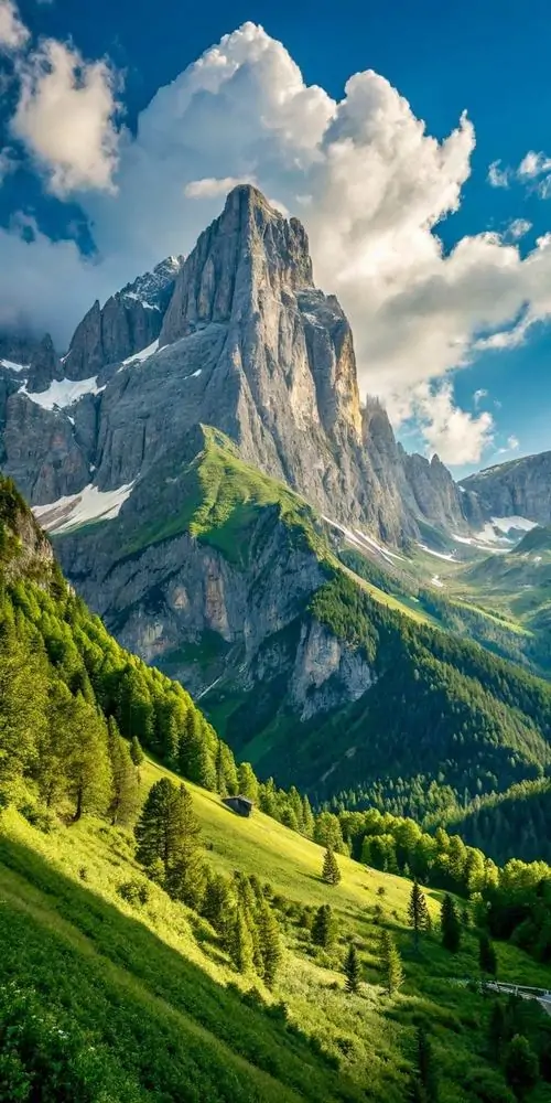 Cỏ non và hoa dại trải kín triền đồi dưới ngọn núi nhọn vươn cao, ánh sáng trong trẻo làm khung hình dọc này đẹp theo kiểu sáng sạch và dễ chịu