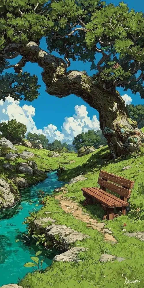 Hình nền cây cổ thụ tán rộng đứng bên dòng nước xanh trong, chiếc ghế gỗ đặt dưới nắng sớm làm khung dọc này lên rất đẹp cho màn hình điện thoại 4K
