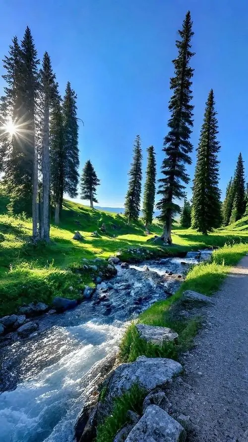 Hình nền phong cảnh mặt trời lóe sáng trên vùng đồng cỏ rực xanh, cụm núi xa và con suối nhỏ làm khung hình dọc vừa đẹp vừa có độ bão hòa màu sắc rõ nét