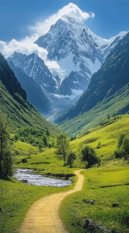 Ảnh wallpaper lối mòn đất cong nhẹ giữa thảm cỏ vàng xanh, ngọn núi tuyết khổng lồ dựng thẳng phía trước tạo điểm nhìn mạnh cho màn hình dọc Ultra HD