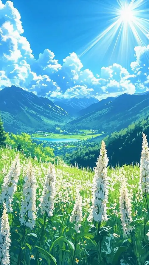 Ảnh nền đt iPhone nắng chiếu xuống cánh đồng hoa trắng trước dãy núi xanh, bầu trời cao và thoáng làm bức hình nền thiên nhiên 4K cho điện thoại thêm phần tươi