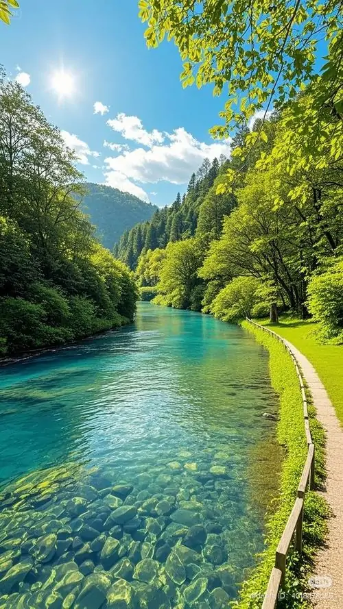 Mặt nước xanh ngọc chạy dọc lối đi ven bờ, nắng rọi qua hàng cây khiến khung cảnh sáng trong và hợp làm hình nền môi trường xanh cho điện thoại