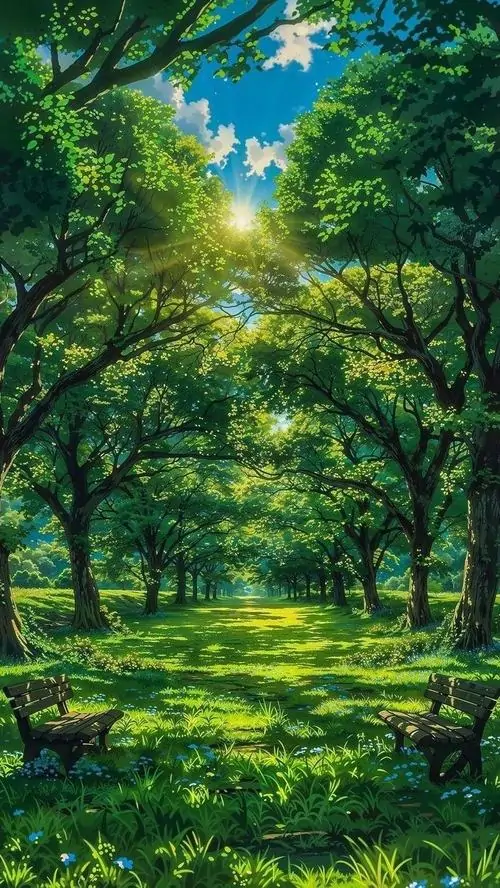 Nắng xuyên qua tầng lá trong khu rừng rậm, thảm cỏ loang sáng dưới gốc cây tạo cảm giác yên và gần, hợp với người thích ảnh nền tự nhiên độ phân giải lớn