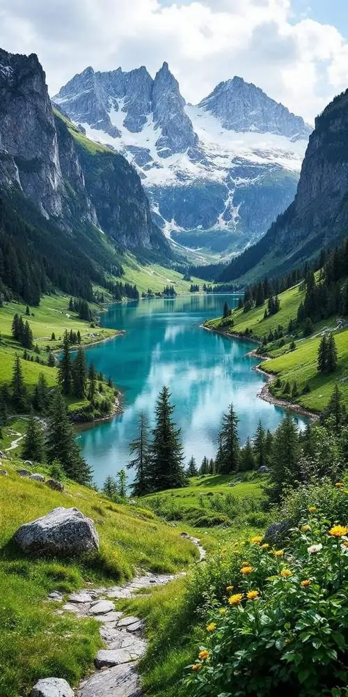 Ảnh wallpaper hồ xanh nằm lọt giữa vách núi đá xám, lối mòn uốn xuống bờ nước và cụm hoa nhỏ phía trước khiến ảnh phong cảnh 4K cho di động rất cuốn