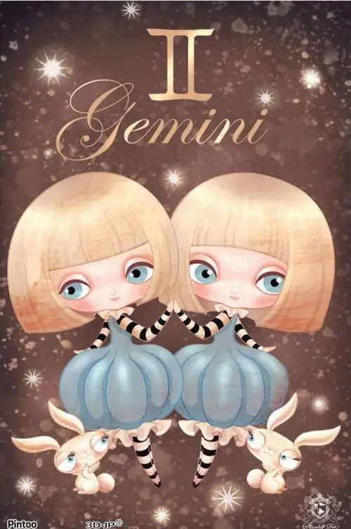 Hai cô gái pastel ngồi cạnh nhau trên ghế, chân khép gọn và tóc hồng xanh đổ xuống vai, phông chữ Gemini phía sau giúp bức tranh hoạt hình Song Tử nữ tí hon thêm phần đáng yêu
